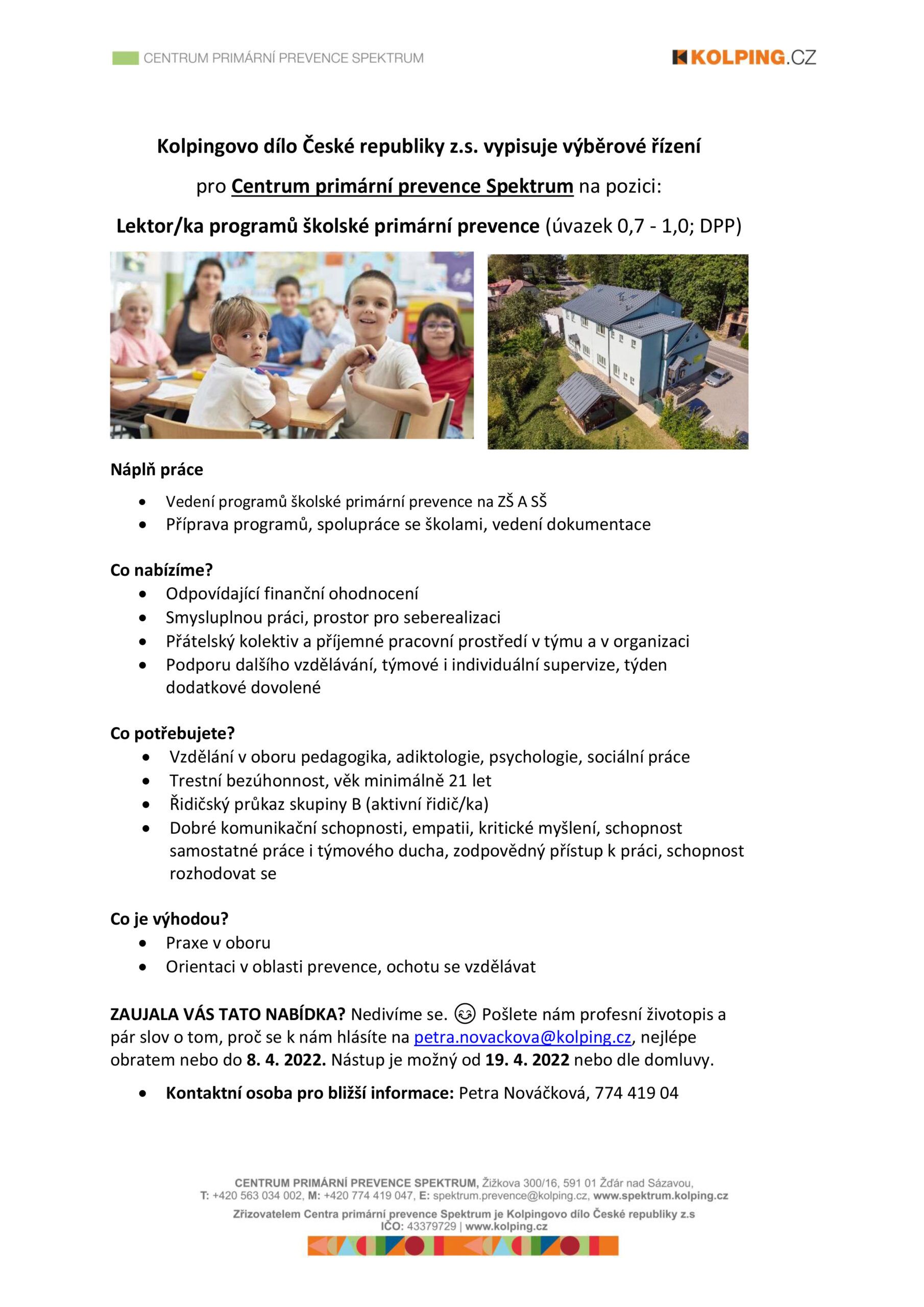 Centrum primární prevence Spektrum vypisuje výběrové řízení na pozici:
