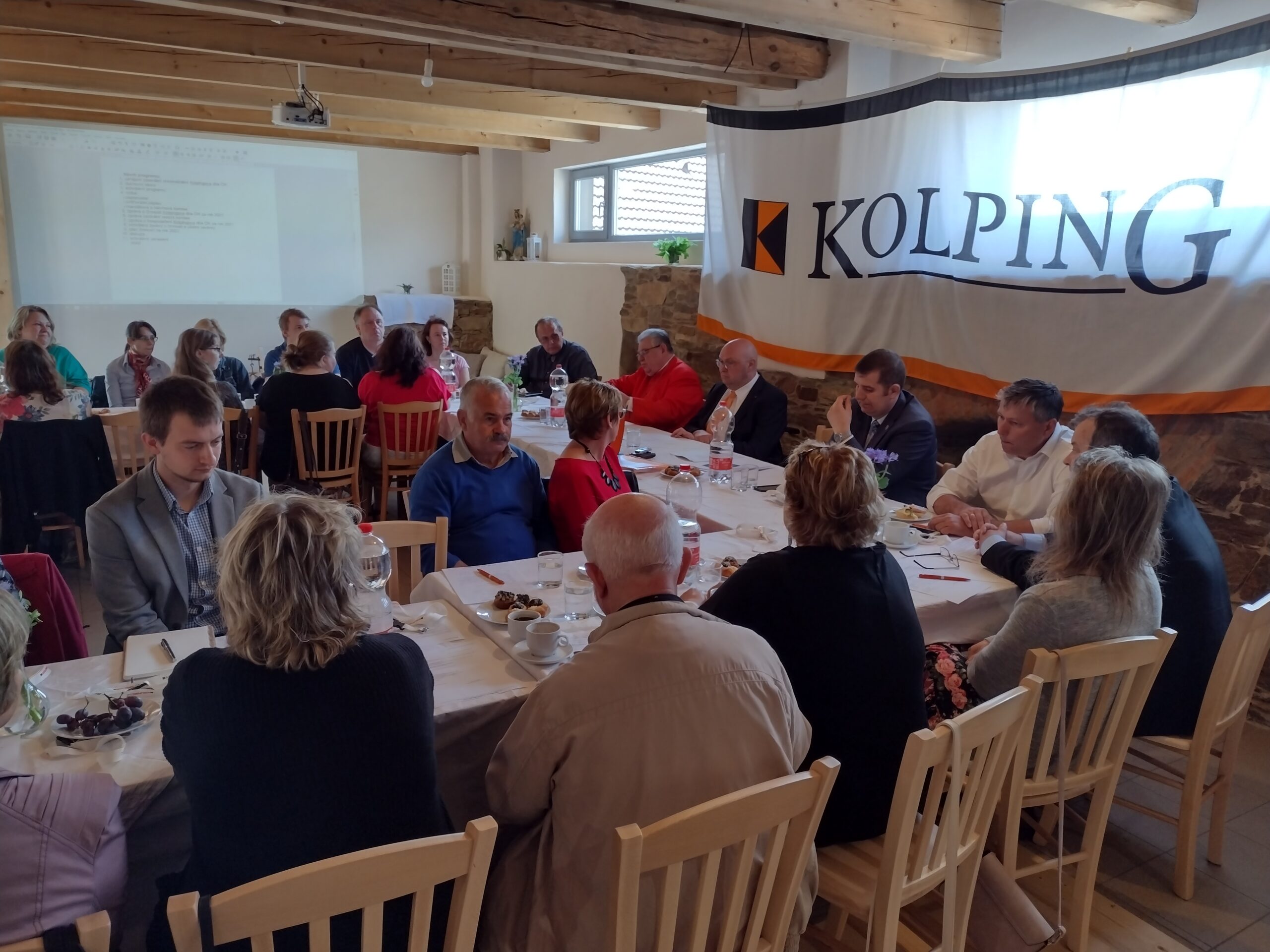 Odpoledne následovala návštěva Poutního kostela na Zelené hoře s výkladem o historii této jedinečné památky UNESCO a od 15 hodin česko – německá mše svatá. Večer byl potom věnován společnému posezení v sále Biskupského gymnázia, kde proběhla krátká prezentace aktivit Kolpingova díla ČR s následnou diskuzí o možnostech budoucí pokračující spolupráce mezi našimi spolky. Večer následně pokračoval neformálním posezením s občerstvením a také živou cimbálovou muzikou.